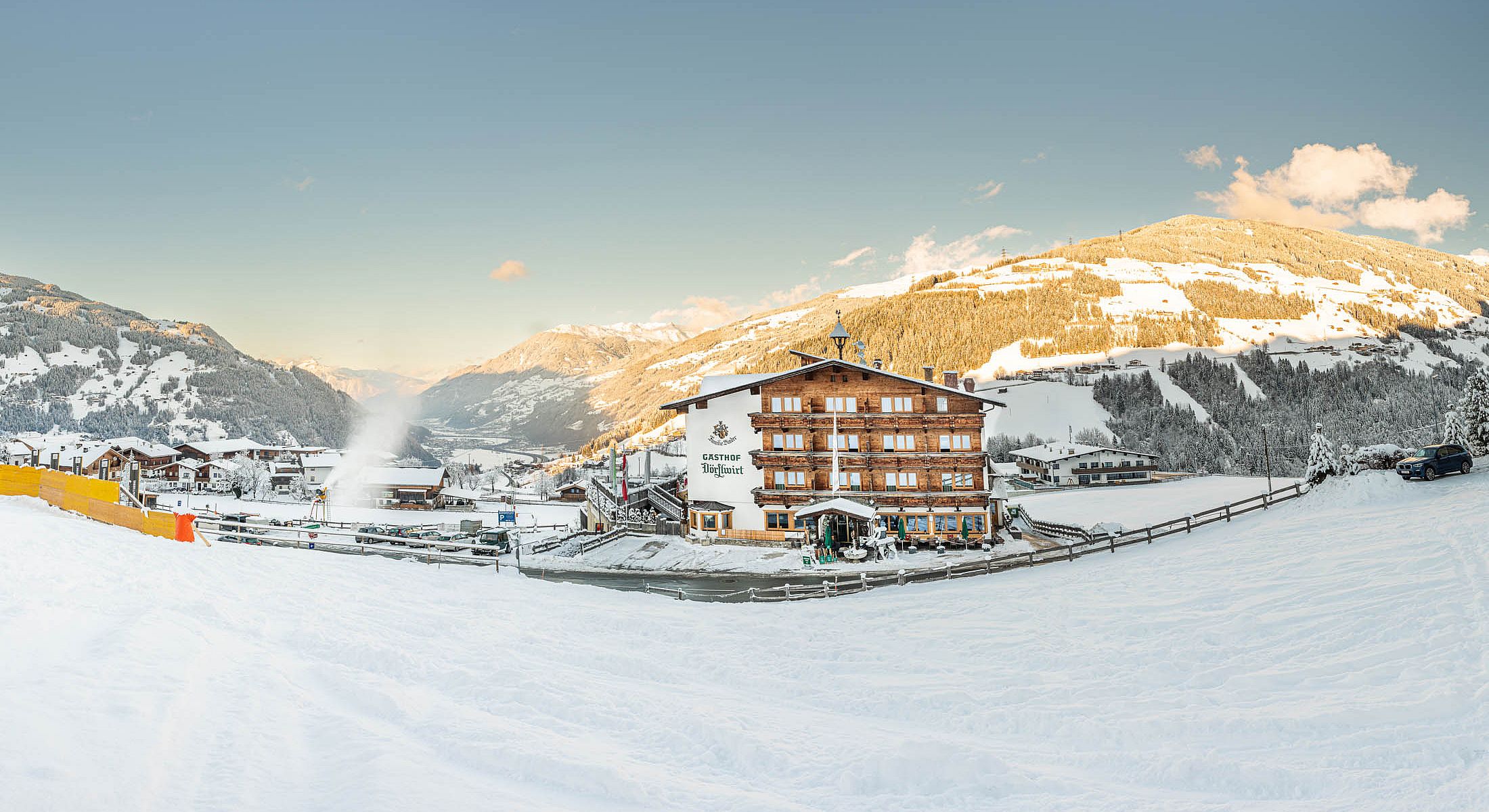 And then there's the peace and quiet here. High up at 910 meters lies our Dörflwirt. You have an incredibly beautiful view over the Zillertal. So you are at the best starting point for a vacation all year round. Spring fever, summer feeling, colorful autumn and in winter a fairy tale in white.